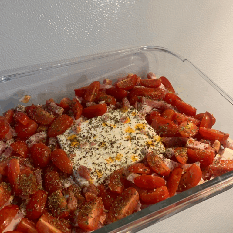 Enfournez pendant 20minutes à 210°C. LEs tomates vont confire, la feta fondre et les lardons vont griller légèrement.