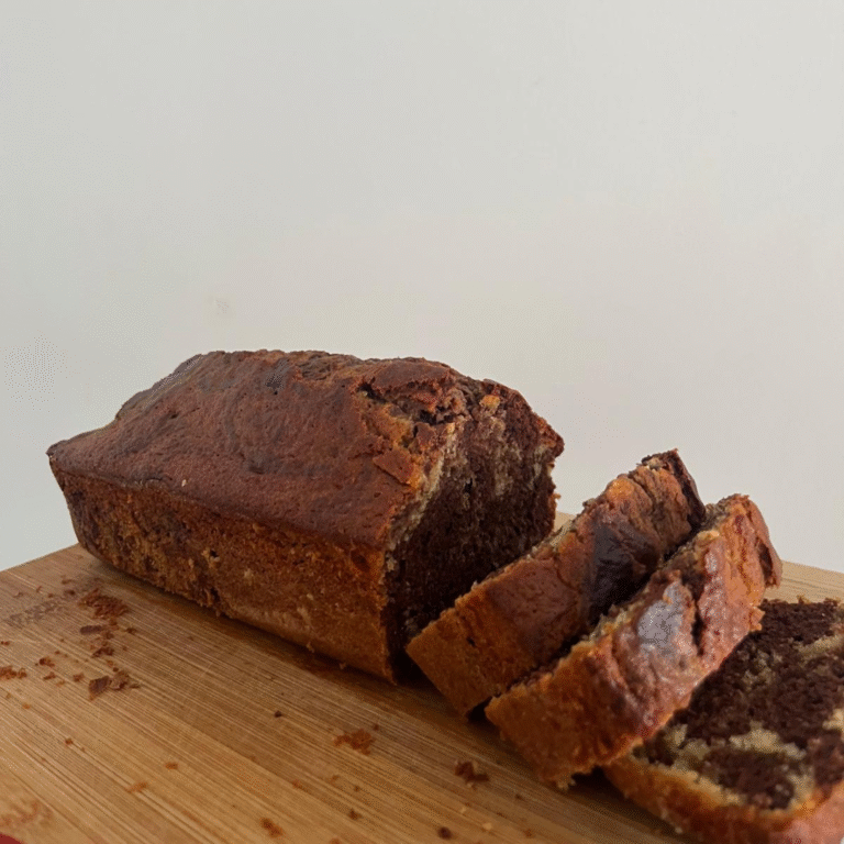 Préchauffez le four à 180 °C. Dans un moule à cake beurré ou antiadhésif, alternez des couches de pâte vanillée et de pâte chocolatée afin de créer l’effet marbré.